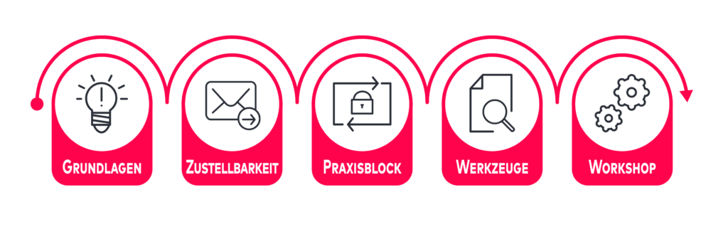 Wir sichern Dir zu, dass Deine Domain während des Kurses spürbar und messbar optimiert wird, um die optimale Zustellbarkeit Deiner E-Mails und höchste Sicherheit Deiner Domains zu erreichen!