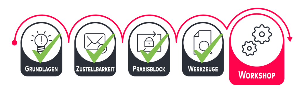 Wir sichern Dir zu, dass Deine Domain während des Kurses spürbar und messbar optimiert wird, um die optimale Zustellbarkeit Deiner E-Mails und höchste Sicherheit Deiner Domains zu erreichen!
